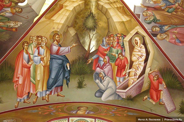 Evanghelistul Ioan relatează că, în ajunul intrării Sale în Ierusalim, cu câteva zile înainte de Patimile Sale, Mântuitorul Iisus Hristos a venit în Betania, chemat fiind de surorile lui Lazăr (prieten al lui Iisus), Marta și Maria, în casa cărora Iisus a fost găzduit de mai multe ori pe timpul activității sale publice. Lazăr era bolnav, așa că surorile au trimis după Iisus, ca să vină în casa lor și să-l vindece. Dar Lazăr a murit până la venirea lui Iisus, și așa are loc marea minune a învierii lui Lazăr, care, deși mort de patru zile și depus în mormânt, este readus la viață de către Mântuitor. Atunci mulți dintre evreii care se găseau acolo au crezut în El.