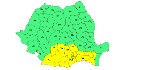 Pe parcursul zilei de luni, în cea mai mare parte a Olteniei, Munteniei și local în Dobrogea continentală, se vor înregistra temperaturi ridicate pentru această dată, iar maximele se vor situa în general între 33 și 35 de grade.