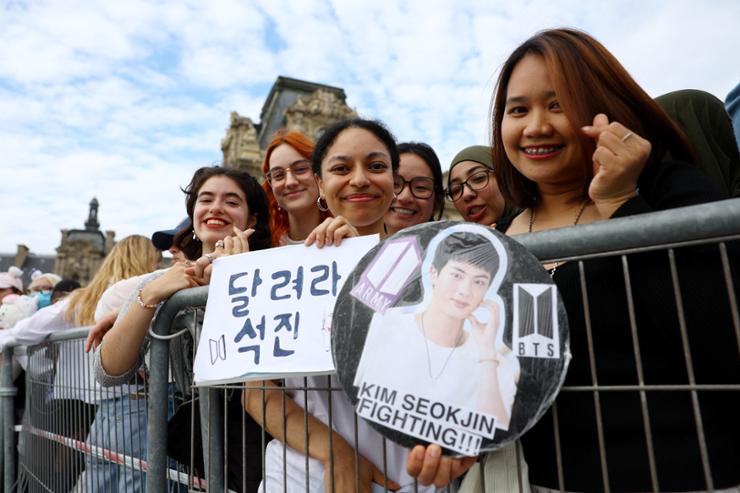 Fanii țineau pancarte scrise de mână în coreeană care spuneau: „Bun venit, Seok-jin, te iubesc”, „Alergă, Seok-jin” și „Noroc, Seok-jin”. ARMY au „venit înarmați” și cu steagurile Coreei de Sud. Kim Seok-jin este numele de naștere al lui Jin.