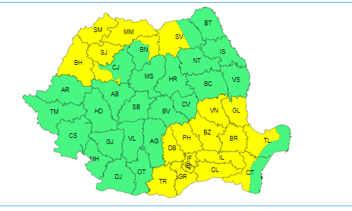 Agenția Națională de Meteorologie a emis astăzi un cod galben de instabilitate atmosferică. Codul este valabil doar azi 16.07.2024 începând cu ora 12 până la ora 21.