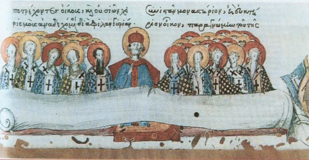 Însă Eutihie, având ajutor pe cei fără de Dumnezeu fameni ai împărătului, n-a încetat a face amestecare și tulburare, până ce a murit Teodosie. După ce a luat împărăția, Marcian a poruncit să se facă sinod a toată lumea, și s-au adunat 630 de episcopi. Și alcătuind și o parte și alta, adică drept-credincioșii și ereticii, două tomuri și deschizând racla Sf. Mucenițe Eufimia, le-au pecetluit, și le-au pus pe pieptul ei. Și peste puține zile făcând rugăciune și deschizând, au văzut și s-au spăimântat; pentru că au văzut tomul ereticilor lepădat sub picioarele Sfintei, iar tomul drept-credincioșilor ținut în cinstitele ei mâini.