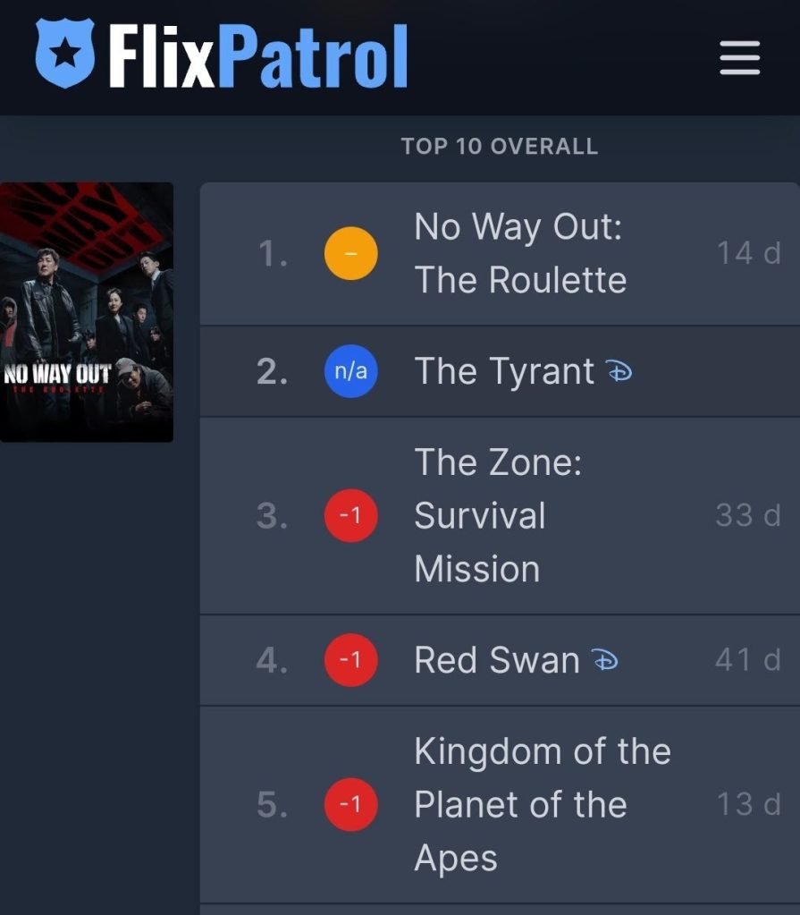 Toate episoadeleu au fost deja încărcate pe platforma de streaming. Conform statisticilor celor de la FlixPatrol din data de 15 august, The Tyran ocupă a două pozție. De asemenea „puterea K-dramelor” s-a văzut și în clasamentele din Hong Kong și Taiwan, ocupând locurile 8 repsectiv 6. În plus, Tiranul domină platforma națională de căutare și recomandare OTT, Kinolights, clasându-se pe primul loc.
