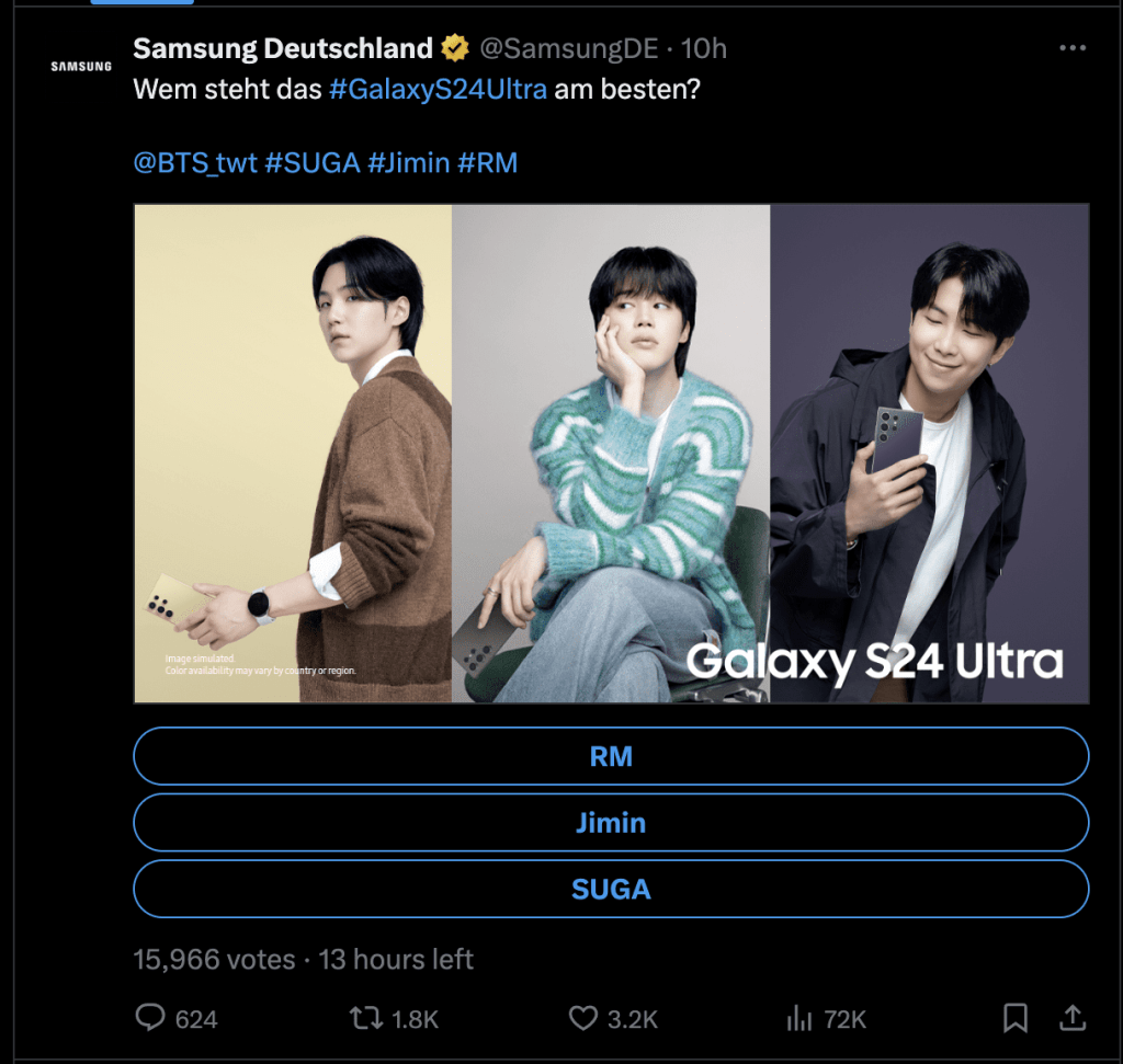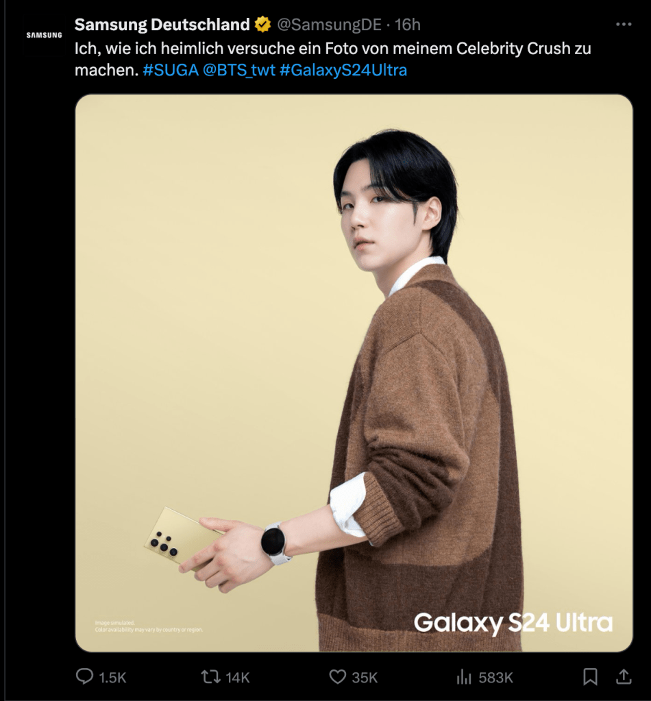 În timp ce în următoarea zi, au postat o altă reclamă cu Suga alături de membrii BTS, RM și Jimin, întrebând: „Cine arată cel mai bine cu #GalaxyS24Ultra?” și încuranjând fanii să voteze.