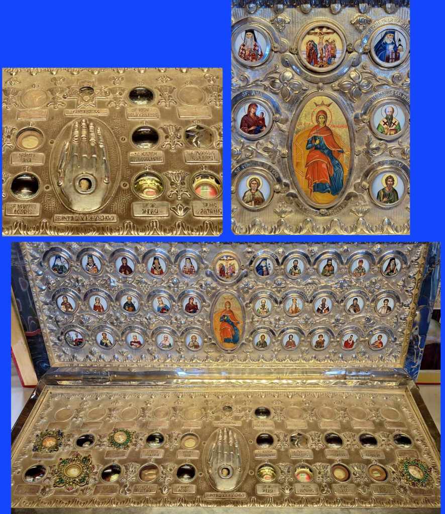 În aceeași raclă se află așezate spre cinstire și închinare moaște ale Sfintei și Dreptei ANA, bunica lui Hristos și mama Născătoarei de Dumnezeu, o părticică din Lemnul Sfintei și de Viață Făcătoarei CRUCI pe care a fost răstignit Mântuitorul Iisus Hristos și alte sfinte moaște ale sfinților: