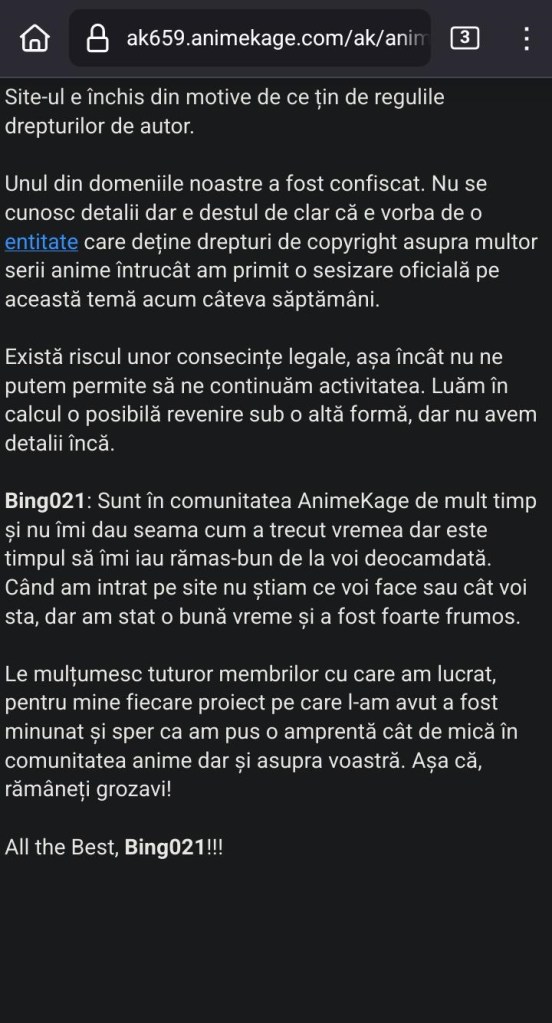 În ultima perioadă au fost închise multe site-uri de streaming anime „ilegale”, precum Aniwave.to sau Anix.to . Se pare că fenomenul a ajuns și la noi. Din partea mea niște jeguri de reguli, să ofere crunchyroll, netflix și disney+ colecția pe care o oferea AnimeKage, că deh, îs cu bani. Netflix și Disney+ au o colecție de tot râsul iar Crunchyroll, care e disponibil în România și are o selecție destul de ok NU ARE LIMBA ROMÂNA, trebuie să te uiți în engleză!!