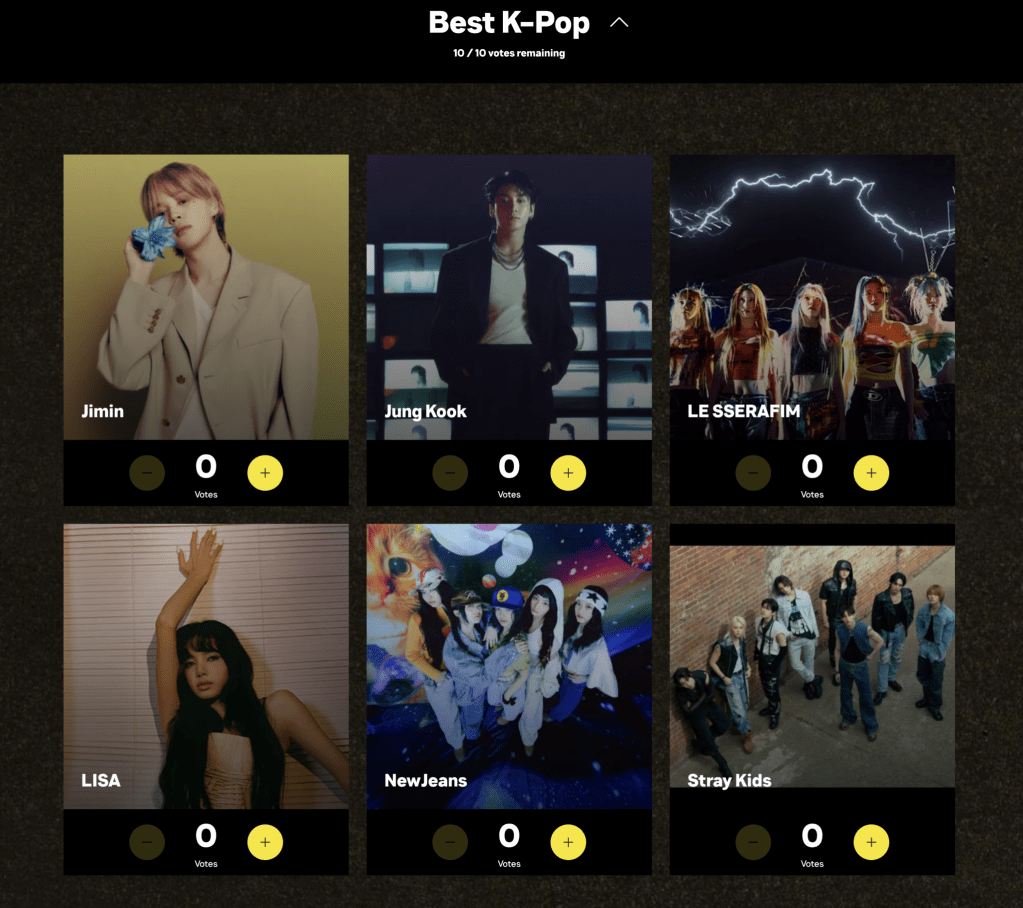 De la introducerea acestei categorii din 2019, BTS a fost cel mai premiat grup, dar anul acesta marchează un moment special, deoarece atât Jimin, cât și Jungkook sunt nominalizați ca artiști solo, evidențiind realizările lor individuale în afara trupei.