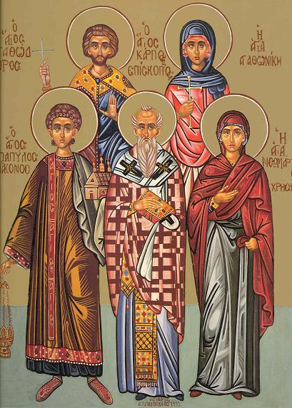 În această lună, în ziua a treisprezecea, pomenirea Sfinților Mucenici Carp și Papil, Agatodor și Agatonica.