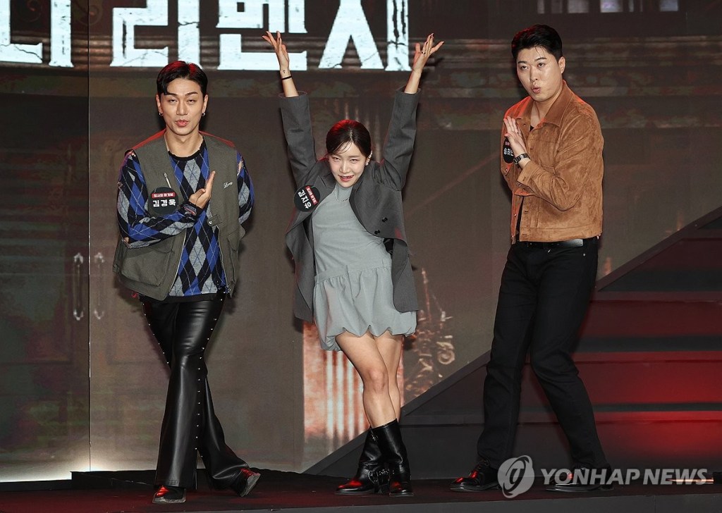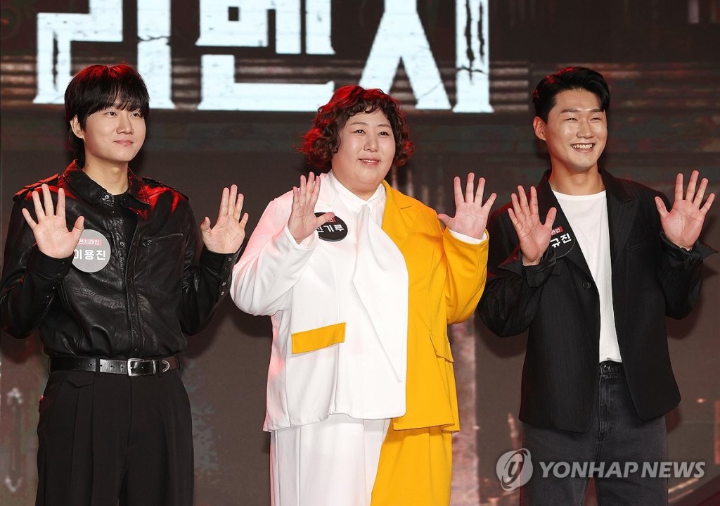 The stars of the Netflix show „Comedy Revenge” – Kwak Beom, Lee Sun-min and Lee Jae-yul (L to R) – pose for a photo during a publicity event in Seoul on Oct. 14, 2024. The reality show will be released worldwide on Oct. 15. (Yonhap)/2024-10-15 15:57:44/