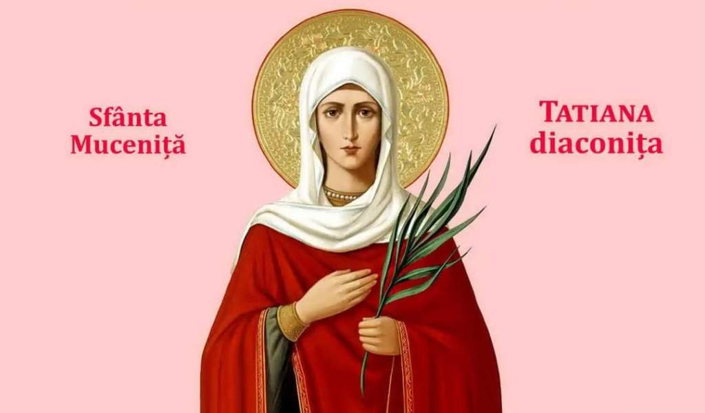 Această Sfântă Muceniță Tatiana era de neam din Roma cea veche, și a trăit pe timpul împărăției lui Alexandru. Tatăl ei a îndeplinit de trei ori dregătoria de consul, iar în timpul impăratului Alexandru Sever (222-235) a devenit și diacon al Bisericii. Iar sfânta, pentru că mărturisea pe Hristos au dus-o la împărat. Intrând împreună cu împăratul în templul idolilor, prin rugăciunea ei, s-au zguduit și au căzut jos idolii din templu. Pentru aceasta a fost supusă la felurite chinuri și apoi i s-a tăiat capul.