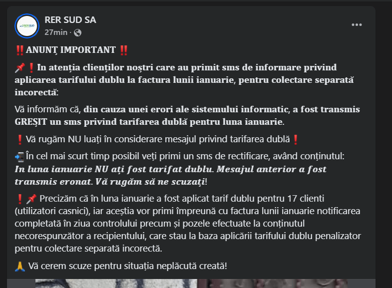RER Buzău a transmis scuzele sale sincere pentru confuzia creată și a rugat clienții să ignore mesajele inițiale privind tariful dublu. Compania a promis că va rezolva rapid problemele tehnice și va asigura o comunicare mai clară pe viitor.