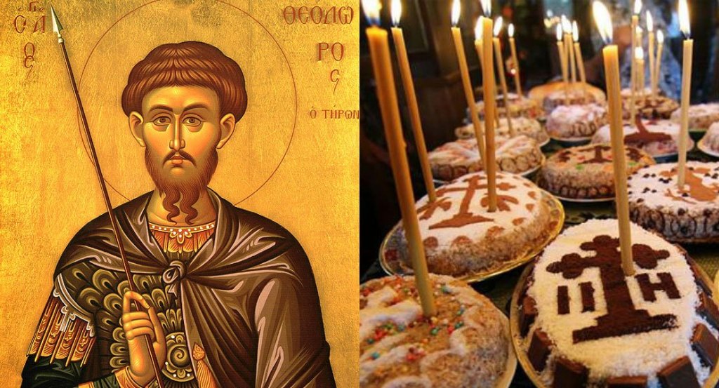 Sf. Teodor, apărându-i în vis Arhiepiscopului Eudoxie, i-a poruncit acestuia să-i anunţe pe creştini să nu cumpere nimeni nimic din piaţă, ci mai degrabă să mănânce grâu fiert cu miere (coliva).