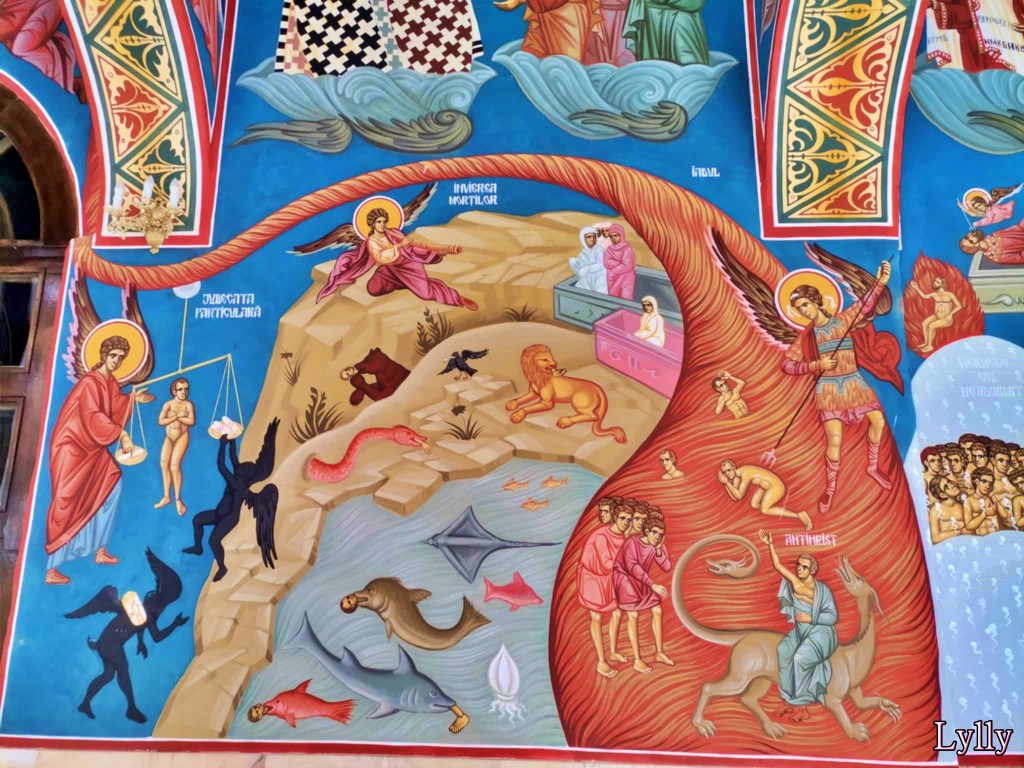 De cum am ajuns în dreptul bisericii, pictura exterioară a acesteia mi-a atras atenția. În dreapta era reprezentată Judecata de Apoi. Tehnica și culorile vii o fac atât de autentică încât ți se pare că e reală. Pentru câteva secunde sângele îți îngheață în vene și toată viața pare că-ți trece prin fața ochilor. Ajungi să te întrebi: Oare am făcut ceva bine de când m-am născut și până acum?! Sau voi ajunge și eu ca acest suflet amărât în iad?!