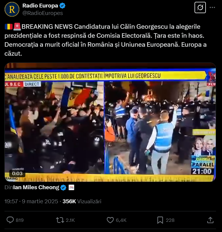 Radio Europa Liberă a postat pe X (fostul Twitter) un mesaj alarmant: „BREAKING NEWS: Candidatura lui Călin Georgescu la alegerile prezidențiale a fost respinsă de Comisia Electorală. Țara este în haos. Democrația a murit oficial în România și Uniunea Europeană. Europa a căzut.”