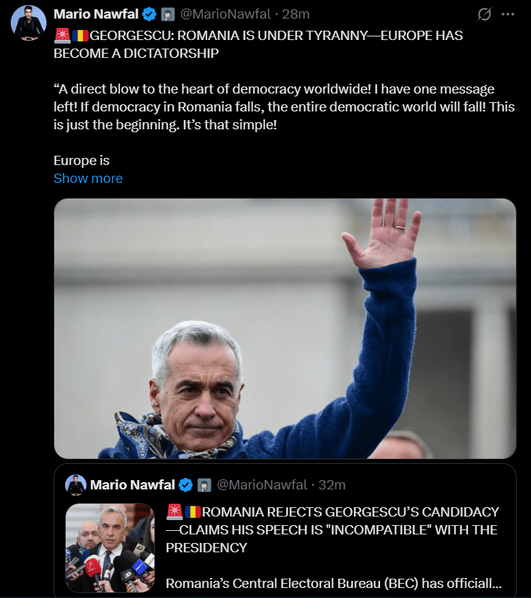 Mesajul a fost distribuit ulterior de Elon Musk pe contul său personal, iar Mario Nawfal, un influențator internațional, a reluat declarația lui Georgescu: „ROMÂNIA ESTE SUB TIRANIE – EUROPA A DEVENIT O DICTATURĂ.”