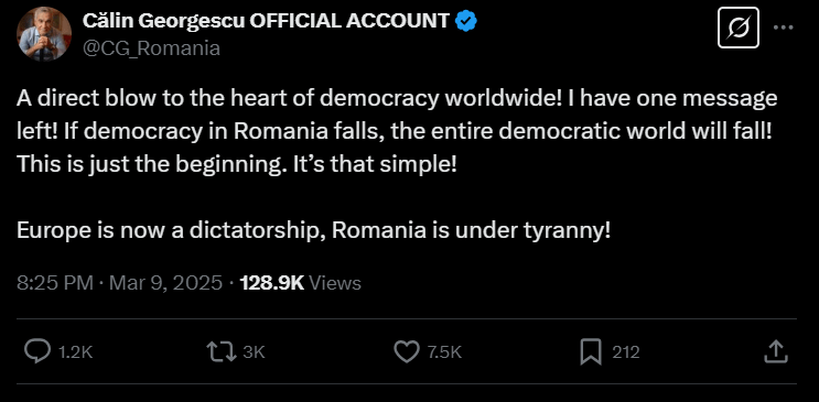 „O lovitură directă în inima democrației mondiale! Mai am un singur mesaj! Dacă democrația din România cade, întreaga lume democratică va cădea! Acesta este doar începutul. Este atât de simplu! Europa este acum o dictatură, România este sub tiranie!”, a scris Georgescu pe rețeaua de socializare.