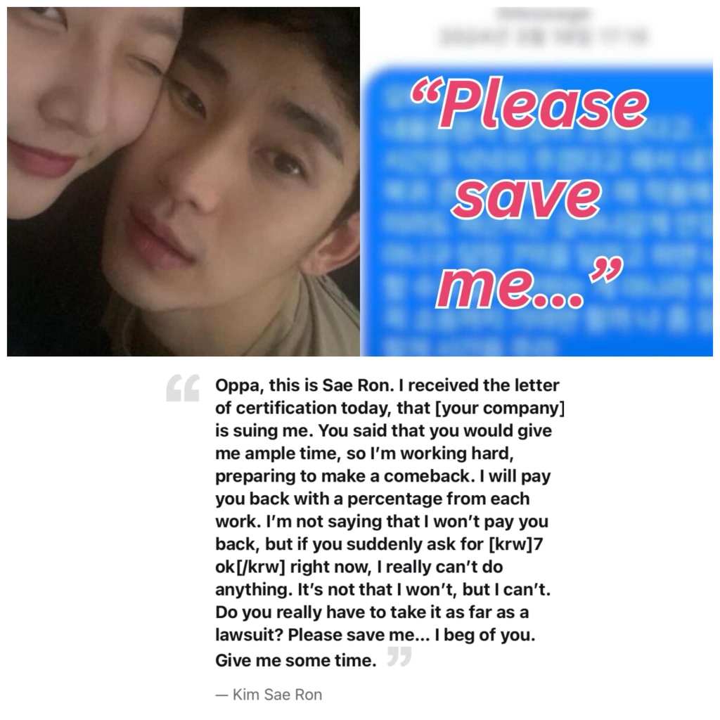 „Oppa, sunt Sae Ron. Am primit o scrisoare certificată – sunt dată în judecată. Mi-ai spus că îmi vei acorda mai mult timp, așa că m-am pregătit cu sârguință pentru revenirea mea, planificând să vă răsplătesc puțin câte puțin din fiecare proiect. Nu e vorba că refuz să plătesc, dar pur și simplu nu pot să adun 700 de milioane de woni dintr-o dată. Te rog, te rog, da-mi mai mult timp.”