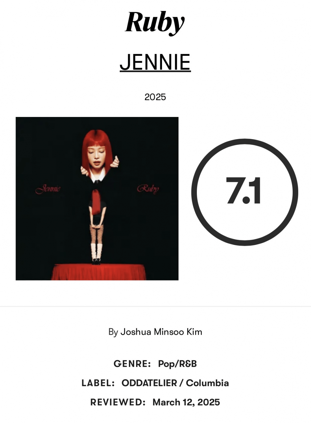 Jennie nu doar că a depășit propriile colegine din BLACKPINK, ci a stabilit un nou record. Albumul Alter Ego al Lisei a primit un 5,2, iar Rosie al lui Rosé a obținut un 5,5. În plus, Ruby a depășit și cel mai bun scor al grupului BLACKPINK, care a fost de 6,5 pentru albumul Born Pink.