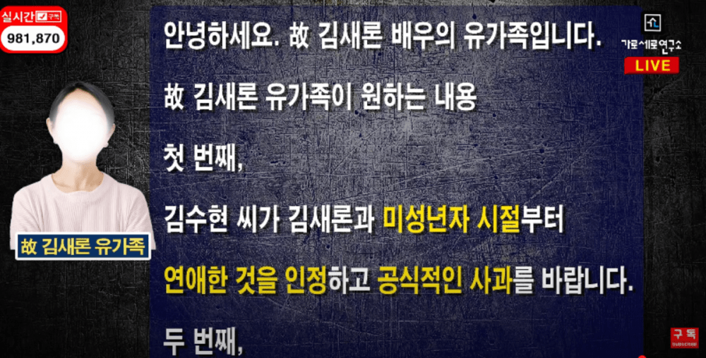 Mama lui Kim Sae Ron a emis o a doua declarație publică, difuzată de Institutul Garosero. Ea a cerut ca Kim Soo Hyun să recunoască oficial relația pe care a avut-o cu Kim Sae Ron în timp ce aceasta era minoră și să își ceară scuze public.