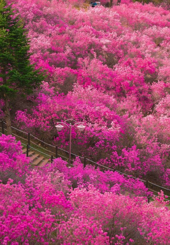 Aflată în mijlocul peisajului montan, această grădină oferă o priveliște impresionantă cu mii de azalee care înfloresc în nuanțe vibrante de roz, mov și alb, creând o atmosferă de basm.
