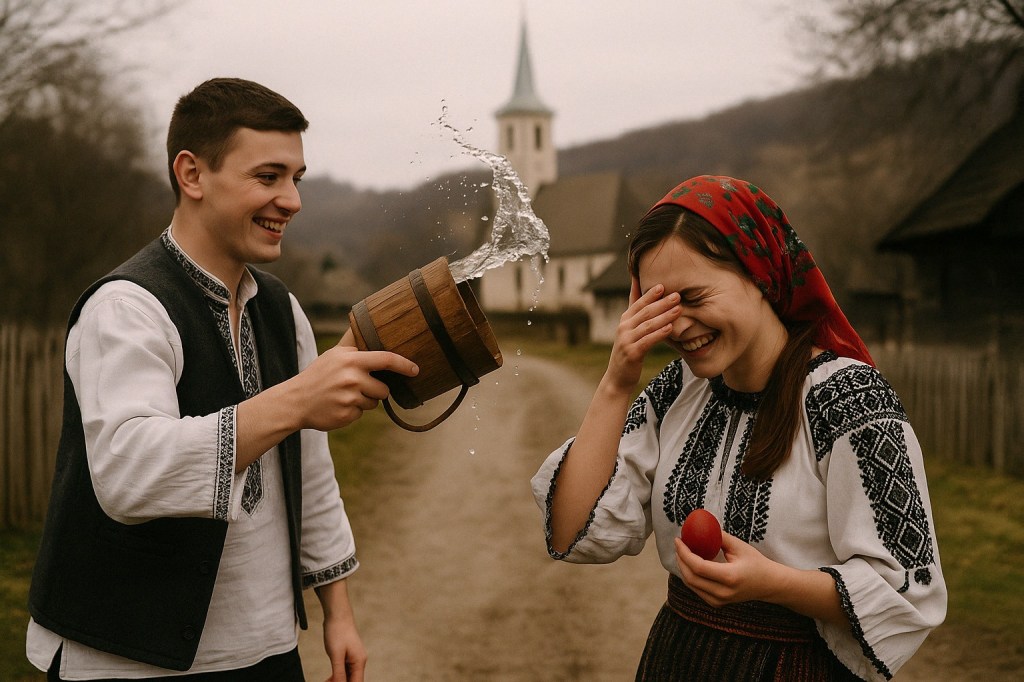 În comuna Trei Sate – Hármasfalu din județul Mureș, tradiția se inversează spectaculos: fetele sunt cele care udă băieții – și nu cu parfum, ci cu… găleți pline cu apă rece!