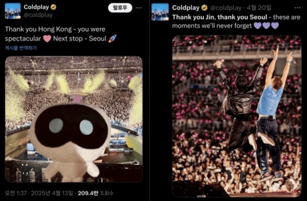 Pe 28 aprilie, rețelele de socializare au luat foc când Coldplay a postat imagini și clipuri emoționante din concertul lor din Soul, în care Jin (BTS) a apărut ca invitat special. Cele două momente care au furat privirile: