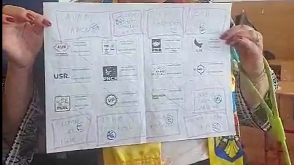 Aflată într-o secție de votare, lidera partidului SOS România a aplicat ștampila pe un buletin de vot pe care a scris de mână numele propriu și al partidului său. Gestul a fost însoțit de o declarație vehementă împotriva procesului electoral și a celorlalți candidați înscriși în cursă.