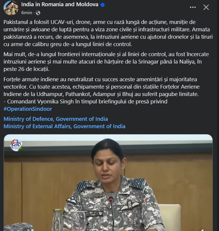 Tensiunile dintre India și Pakistan continuă să crească, pe fondul unei serii de schimburi militare și acuzații grave. Conform unui comunicat oficial emis de Ambasada Indiei la București, Pakistanul ar fi recurs la o gamă largă de mijloace militare pentru a viza atât obiective civile, cât și infrastructuri strategice din teritoriul indian.