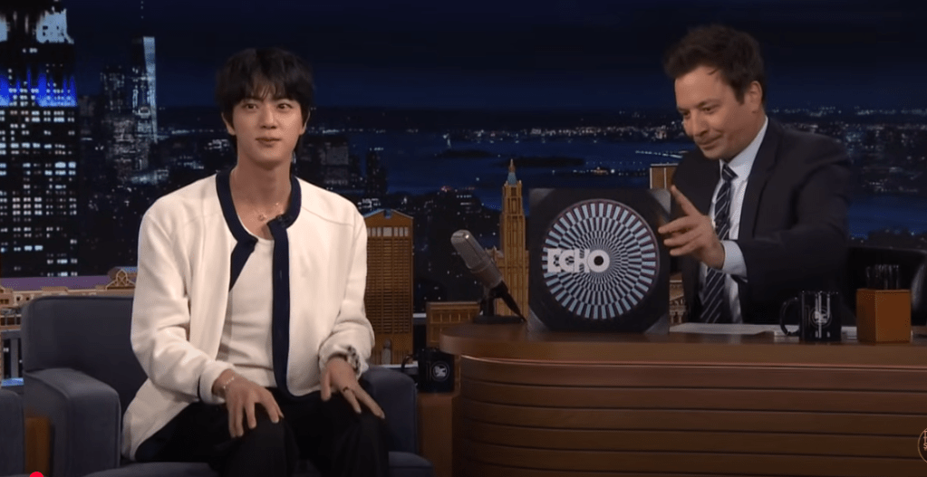Cu această ocazie, Jin a făcut un anunț mult așteptat: al doilea său mini-album, intitulat „Echo”, este oficial lansat, iar artistul se pregătește pentru primul său turneu solo. În cadrul interviului, Jin a discutat cu Jimmy Fallon despre mai multe momente speciale din viața sa recentă, inclusiv întâlnirea cu actorul Tom Cruise și revederea cu trupa Coldplay.