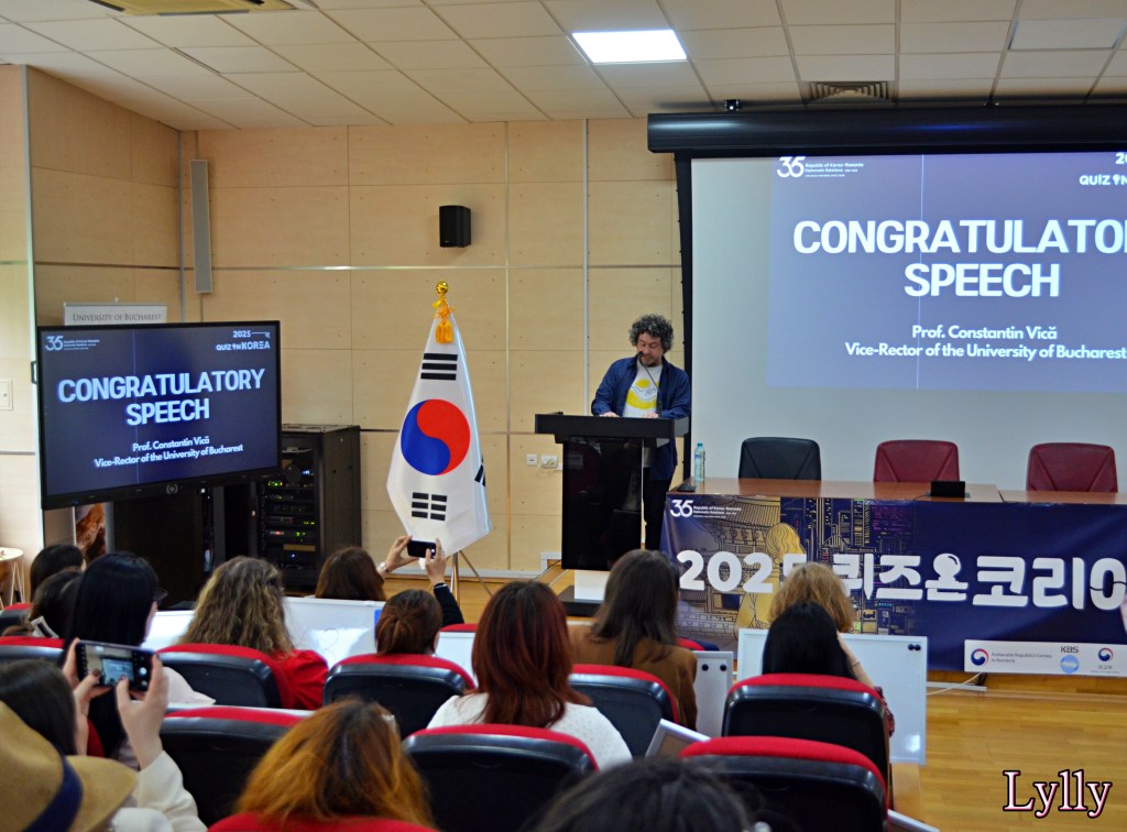 Domnul profesor Constantin Vică, vice-rector al Universității din București, a susținut un congratulatory speech trilingv — în română, engleză și chiar câteva fraze în limba coreeană — un gest care a subliniat deschiderea instituției față de colaborarea interculturală.