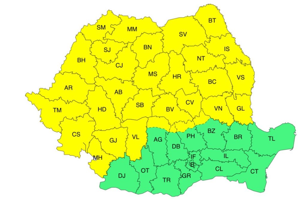 Administrația Națională de Meteorologie (ANM) a emis o avertizare COD GALBEN de instabilitate atmosferică accentuată pentru ziua de 27 iunie, valabilă în intervalul ora 8:00 – 28 iunie, ora 2:00.
