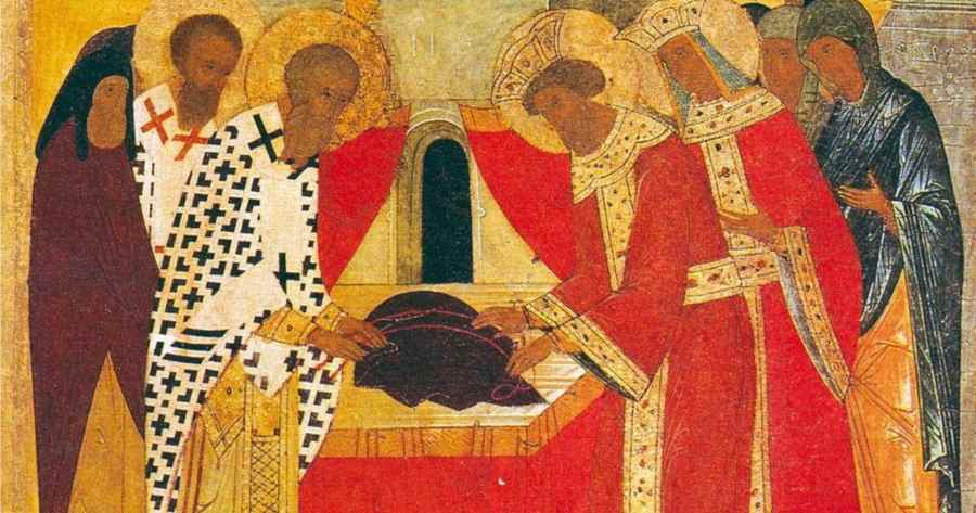 Deci s-au hotarât ei ca sa o ia. Si mergând la Ierusalim, au facut o racla asemenea celei în care se afla cinstitul vesmânt al Maicii lui Dumnezeu; iar când s-au întors, au pus racla cea desarta în locul celeilalte; si pe cea cu sfântul si dumnezeiescul vesmânt, au luat-o si s-au dus. Si daca au sosit la Constantinopol, au pus-o într-un metoc al lor ce se cheama Vlaherne, încercând sa ascunda comoara. Dar vazând ca nu se poate, au dat de stire împaratului, care s-a umplut de nespusa bucurie. Si a facut o biserica la acel metoc, si a pus acolo cinstita racla, unde acum se afla, pazind cetatea si gonind tot vrajmasul si toata boala.