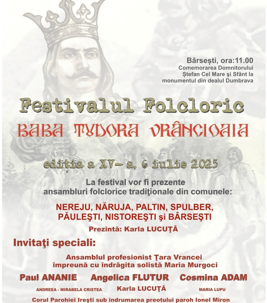 - Ceremonie oficială și moment comemorativ închinat Domnitorului Ștefan cel Mare și Sfânt, cu o reconstituire emoționantă a legendei întâlnirii sale cu Baba Tudora Vrâncioaia, simbol al curajului și ospitalității locale.