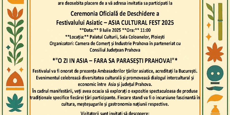Camera de Comerț și Industrie Prahova invită toate persoanele interesate să participe la această manifestare culturală, ce celebrează diversitatea și frumusețea continentului asiatic.