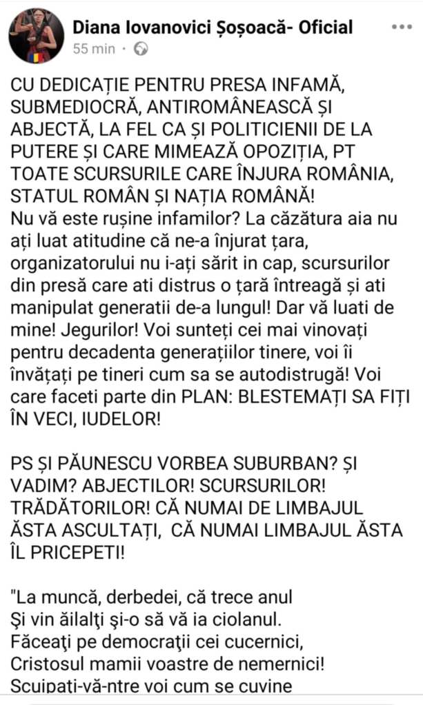 În mesajul publicat pe pagina oficială, Diana Iovanovici Șoșoacă se dezlănțuie împotriva jurnaliștilor, politicienilor și celor care, în opinia dânsei, contribuie la degradarea țării. Șoșoacă îi acuză pe jurnaliști că sunt „scursuri” și pe politicieni că sunt „trădători” și „mimi ai opoziției”.