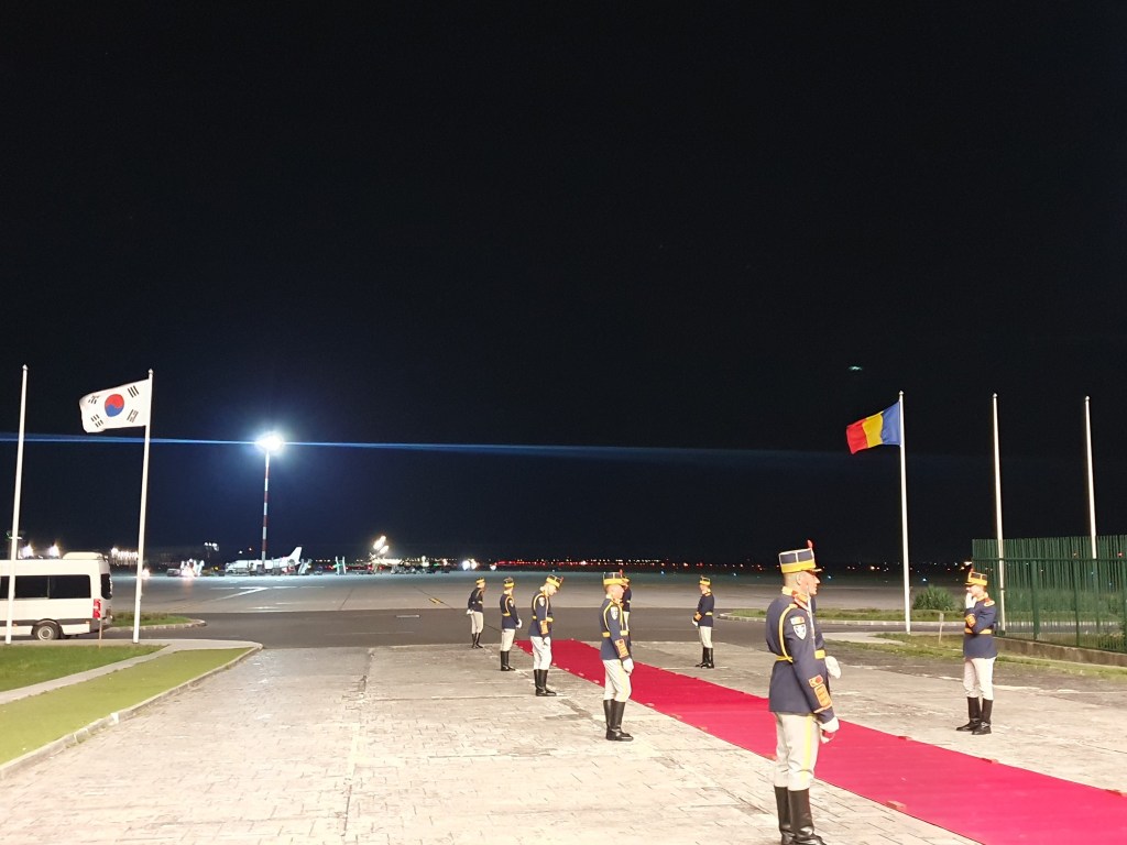 Imaginile postate surprind atmosfera de pregătire pentru eveniment: steagurile Coreei de Sud și ale României au fost arborate și așteaptă cu nerăbdare întâmpinarea oaspetelui special. De asemenea, a fost întins și covorul roșu, iar militarii în uniformă asigură ceremonia de primire. Aceste elemente sunt tipice întâmpinărilor oficiale destinate demnitarilor de top.