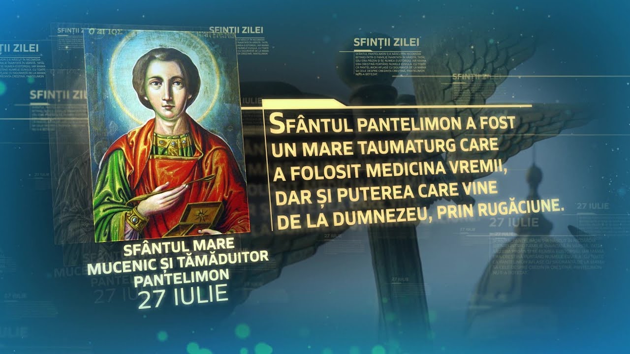 Sfântul și Măritul Mucenic al lui Hristos, Pantelimon, s-a născut la Nicomidia din părinții Eustorgios, senator păgân, și Evula, o creștină; aceștia i-au dat numele de Pantoleon. Încredițat spre educație lui Eufrosin, medic de renume, el ajunse după puțină vreme la o cunoaștere desăvârșită a artei medicale într-atât incât Împăratul Maximian, care îi remarcase calitățile, intenționa să îl ia la palat ca medic particular.