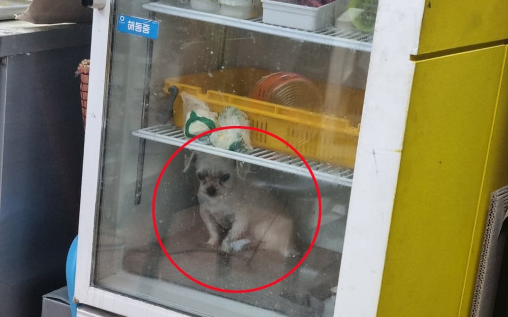Fotografia, care a provocat numeroase reacții, arată o cățelușă de talie mică aflată într-un frigider folosit de o pizzerie din Busan, stârnind suspiciuni de abuz asupra animalelor.