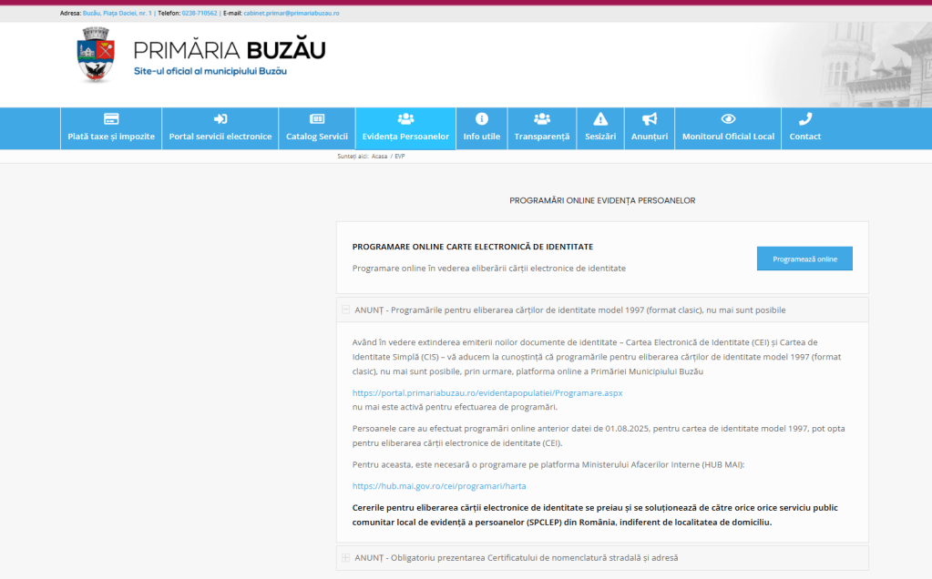 „Programările pentru eliberarea cărților de identitate model 1997 (format clasic), nu mai sunt posibile, prin urmare, platforma online a Primăriei Municipiului Buzău nu mai este activă pentru efectuarea de programări.”