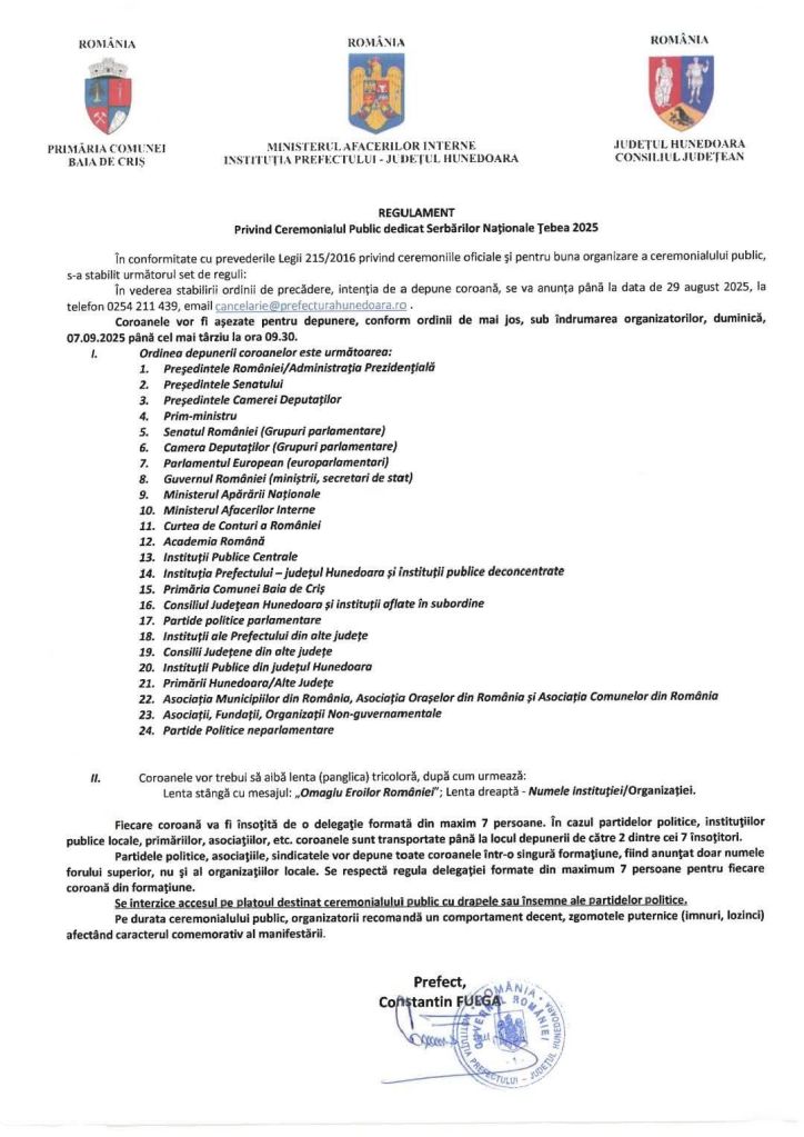 Regulamentul trimis de Prefectură ar conține prevederi care stabilesc cum se depun coroanele, ce texte pot fi scrise pe acestea și chiar interzicerea afișării unor drapele la ceremonia de la Țebea.