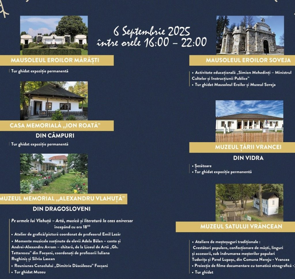 Nu ratați ocazia de a explora comorile ascunse ale muzeelor vrâncene și de a trăi o seară plină de inspirație și emoție. Marcați data de 6 septembrie 2025 și pregătiți-vă să pășiți într-o lume unde istoria prinde viață sub cerul nopții.