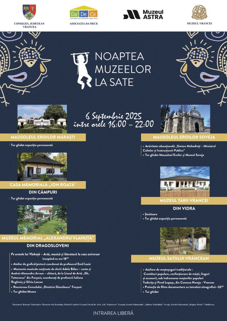 Evenimentul promite intrare gratuită, expoziții fascinante și colecții care spun povești unice despre istoria și cultura Vrancei. Vizitatorii vor avea ocazia să descopere artefacte rare, să participe la tururi ghidate și să se bucure de atmosfera specială creată pentru această seară.