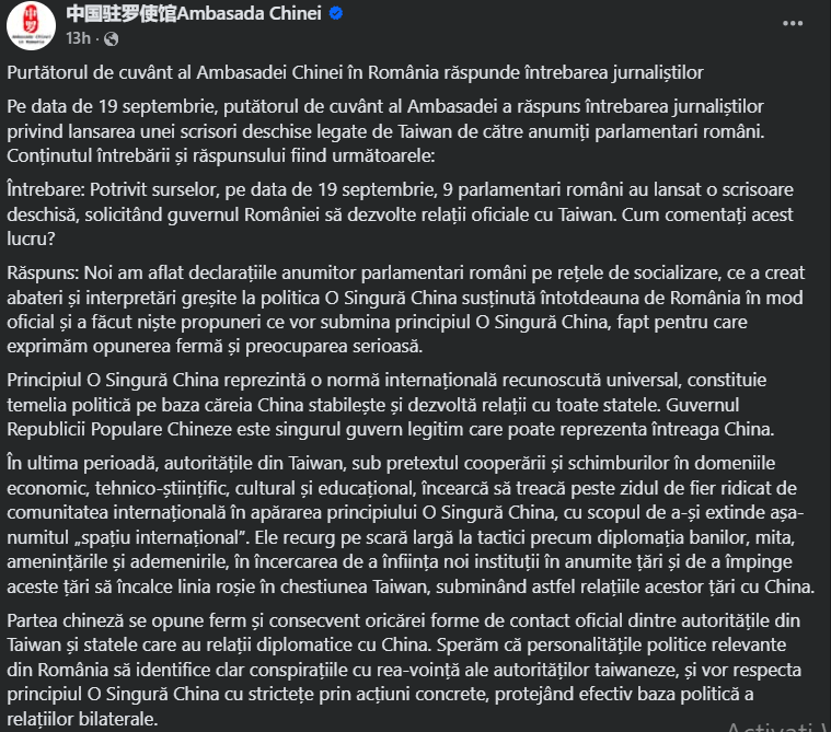 Pe 19 septembrie 2025, purtătorul de cuvânt al Ambasadei Chinei la București a răspuns unei întrebări din partea presei legată de scrisoarea deschisă semnată de 9 parlamentari români, care au solicitat Guvernului României să dezvolte relații oficiale cu Taiwanul.