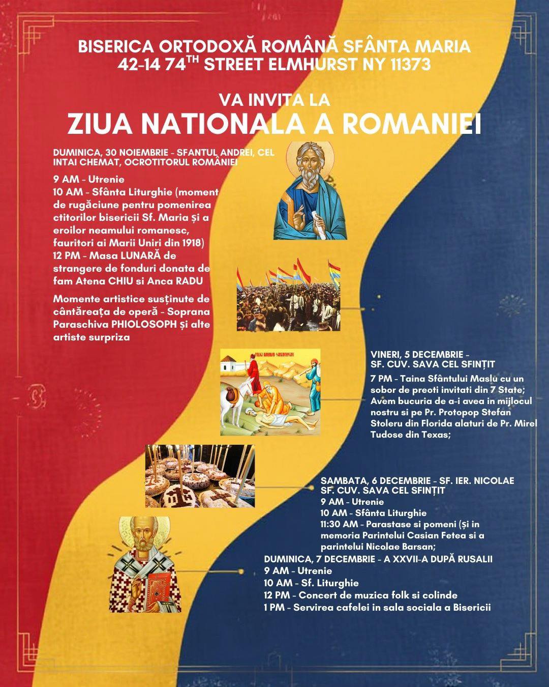 Biserica Ortodoxă Română Sfânta Maria, situată la 42-14 74th Street, Elmhurst, NY 11373, pregătește un program amplu, îmbinând tradiția religioasă cu omagiul adus istoriei și identității românești.