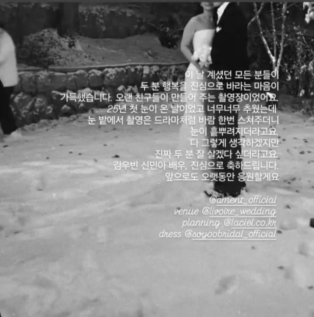 Studioul responsabil de fotografiile de nuntă a oferit, la rândul său, o privire din culise asupra ședinței foto. Potrivit acestora, imaginile au fost realizate într-o locație acoperită de zăpadă, iar un scurt videoclip distribuit online îi arată pe Kim Woo Bin și Shin Min Ah pozând împreună într-un cadru romantic. Chiar dacă fețele lor nu sunt surprinse în detaliu, fanii s-au declarat încântați de atmosfera intimă și elegantă a momentului.