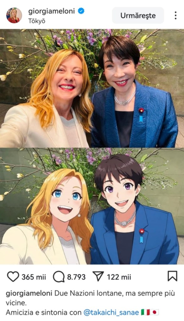 La prima vedere, fotografia publicată de Giorgia Meloni la Tokyo pare un simplu selfie diplomatic. Două lidere zâmbitoare, un decor floral, un moment relaxat. Dar a doua imagine — reinterpretarea în stil anime — schimbă complet registrul și transformă întâlnirea într-un mesaj strategic cu adresă globală.