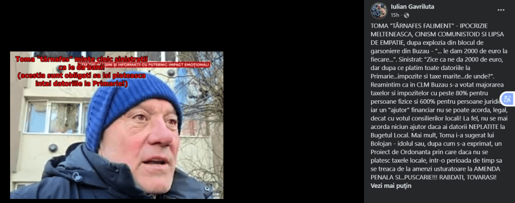 Pe fundal de moloz și oameni în pijamale, intră în scenă primarul Constantin Toma.