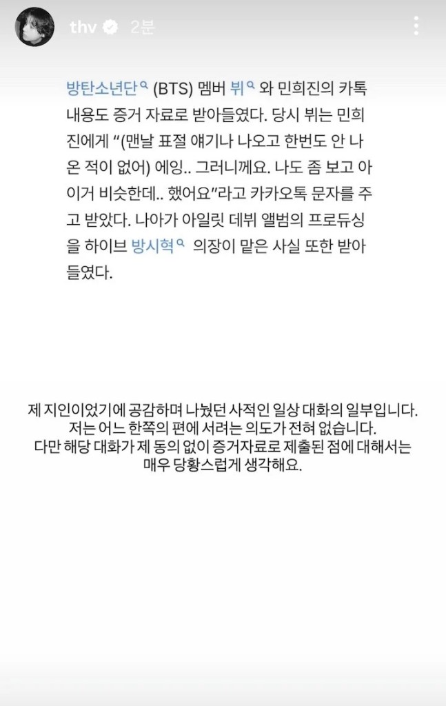Conform relatărilor din 20 februarie 2026, partea lui Min Hee Jin a prezentat instanței mesaje KakaoTalk schimbate între ea și V de la BTS, care au fost acceptate ca probe legale pentru susținerea opiniilor privind similaritățile dintre proiectul ILLIT și NewJeans.