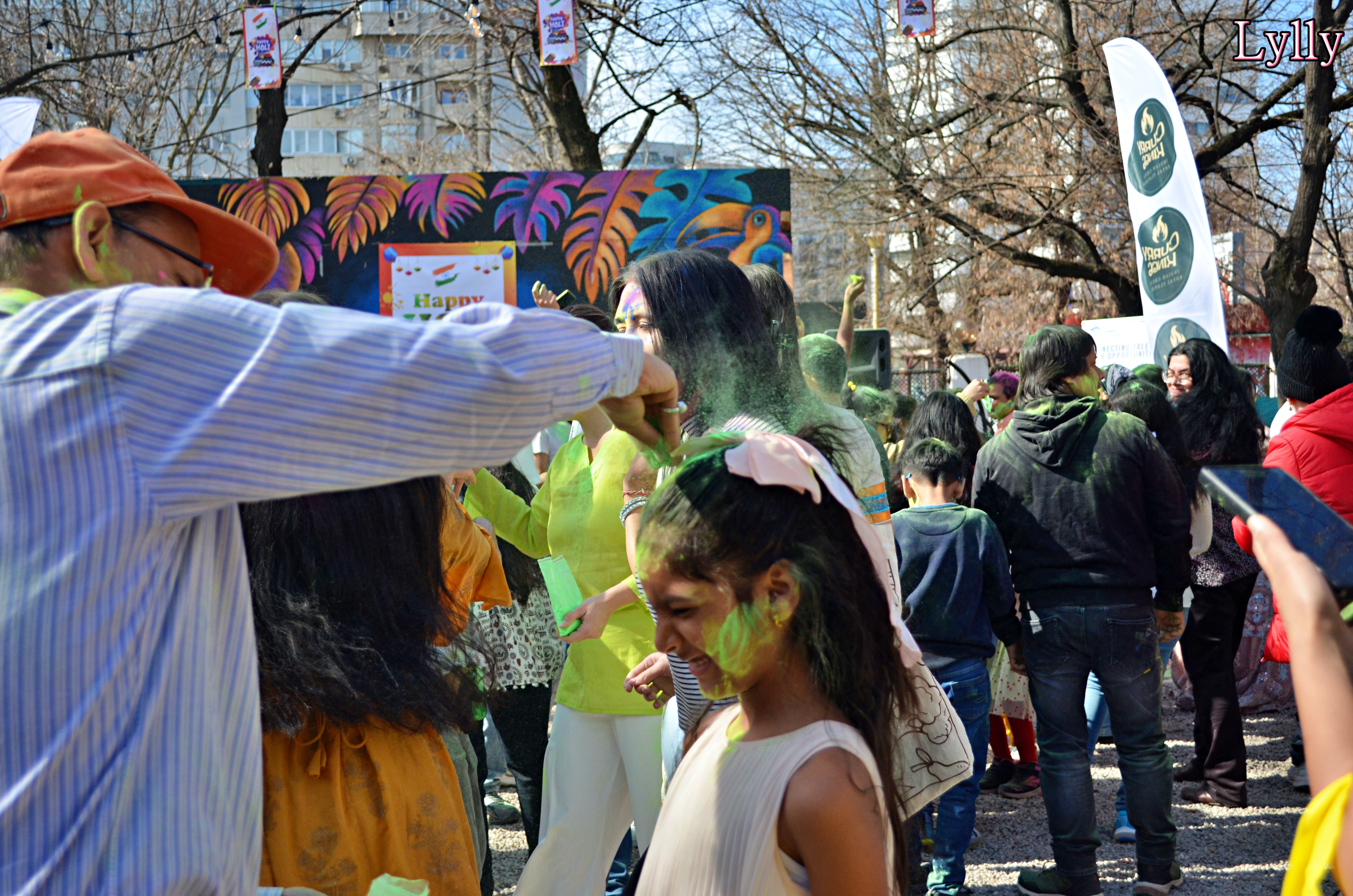La evenimentul organizat la București, oameni de toate vârstele au venit să se bucure de culori. Am primit și eu „vopsea” și, foarte repede, a început ceea ce am numit, în glumă, o „bătaie” cu culori.