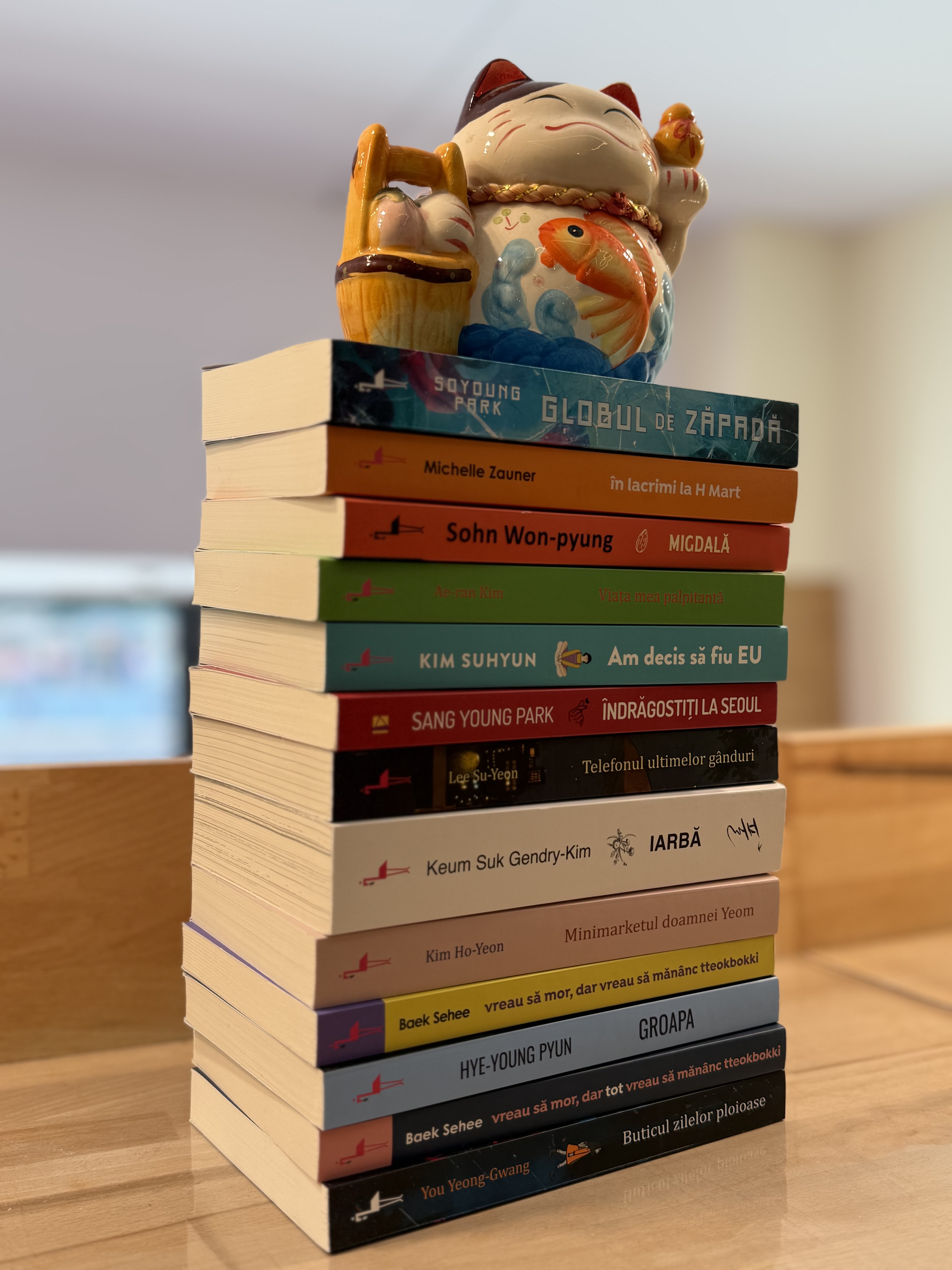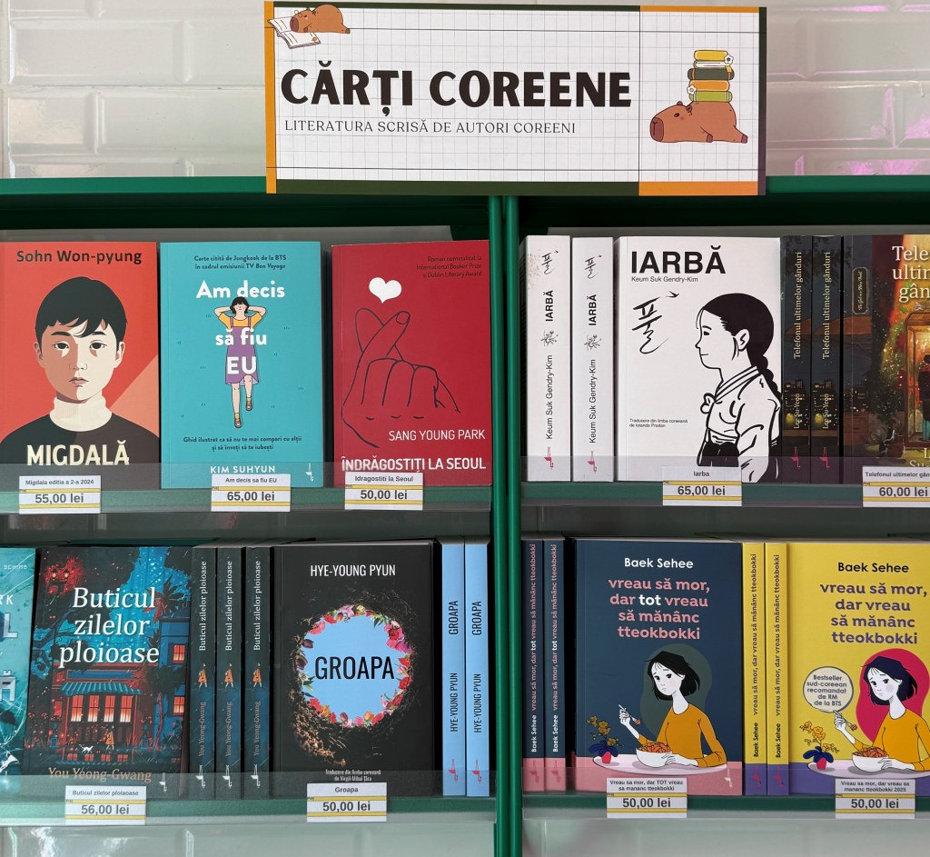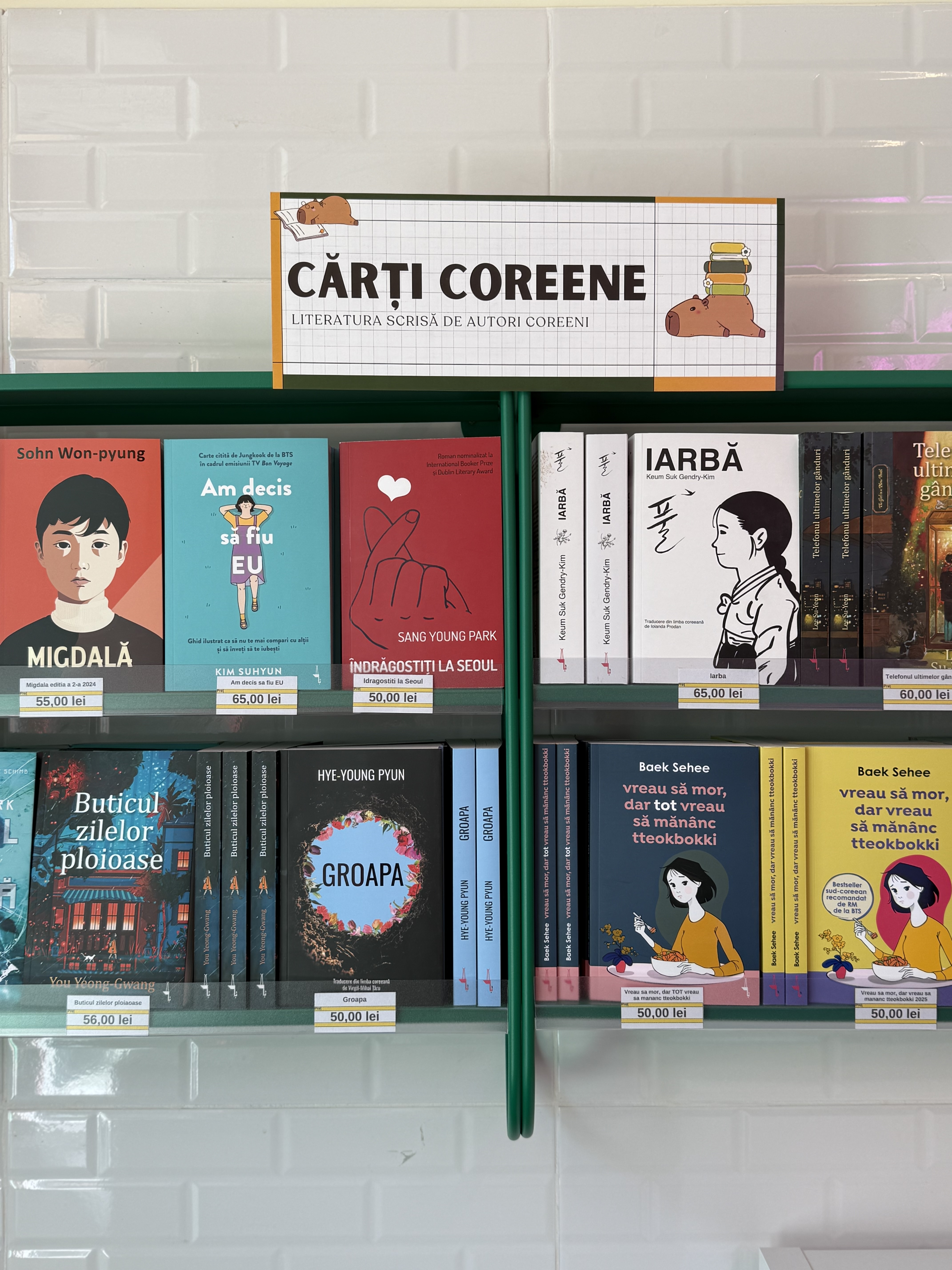 Selecția de cărți disponibile la K-Food Unirii cuprinde unele dintre cele mai apreciate romane contemporane coreene, traduse în limba română și recomandate chiar de artiști K-pop. Printre titlurile de neratat se numără: